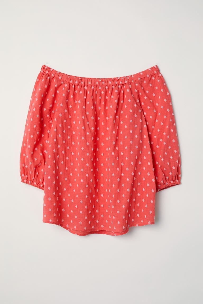 Блузата цвят корал или диня- може би, я имам и много ми харесва. Мислех да си купя втора. Моделът ѝ е широк, на мен също би ми станал по-малък от закупения размер. Но ластиците на ръцете ми стискат, отбелязват се на кожата.