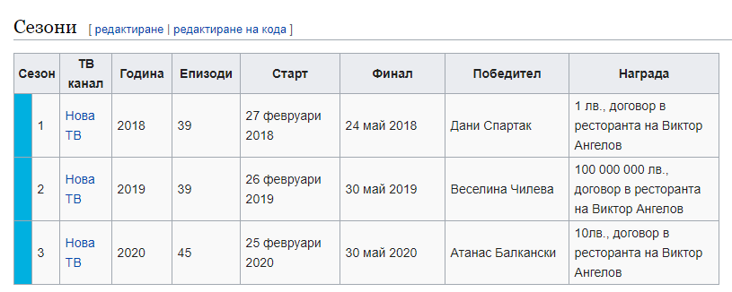 Това с уикипедия кърти. Явно  Чилева е спечелила 10 милиона , а Дани Спартак само левче.   Насето ще спечели 10 лв Grinning