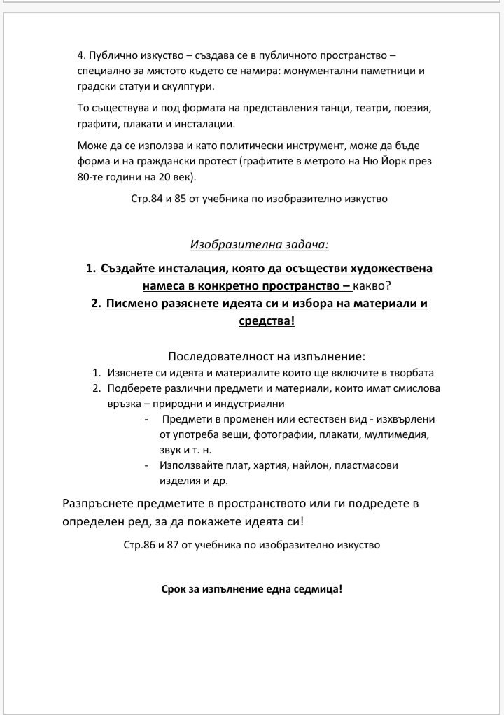 Онзи ден питам учителя им по рисуване (град от селски тип сме и се знаем всички) какъв е тоз зор всяка седмица да рисуваме нещо. Материала в учебника бил за история на изкуството, а децата не искали да го четат и затова им дава проекти всяка седмица...