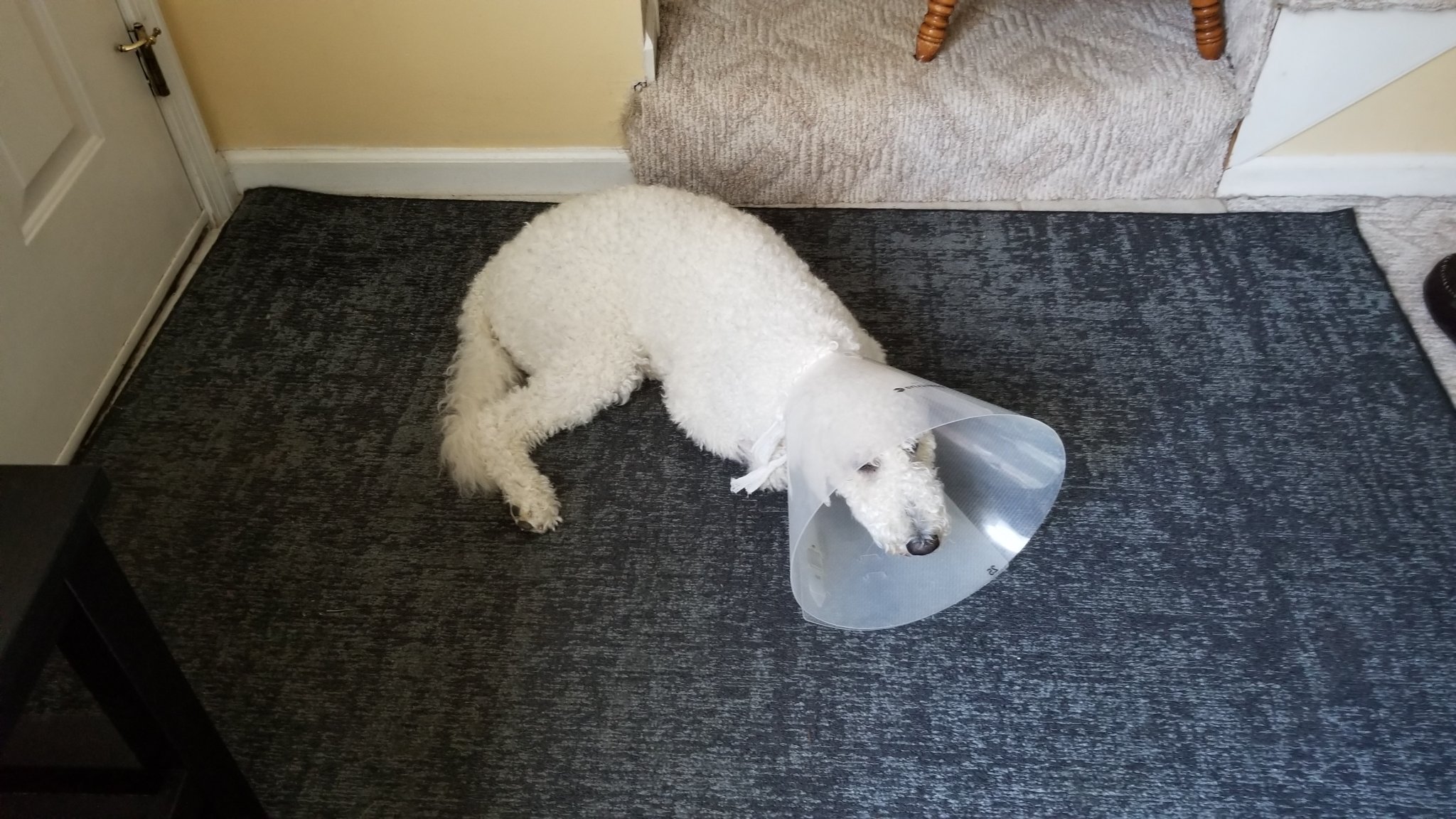Райли е добре.Все по-трудно я удържаме да не скача и да не тича.Всъщност още след операцията като ни я доведоха и тя ни видя,искаше да се затича.Тук е сърдита,защото не й позволяваме все още да се качва по стълбите.Яката трябва да я носи поне още седмица.