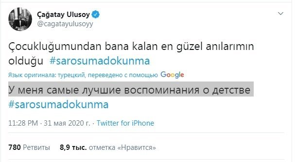 Вчера Чагатай на своей страничке выложил твиттер - "У меня самые лучшие воспоминания о детстве #sarosumadokunma"