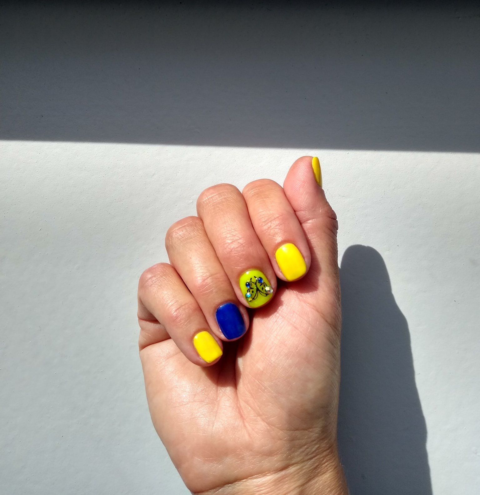 И аз се лакирах вчера. Жълтото ми е новичко( за 1ви път се лакирам с него)- ГД Коко 818(патешко жълто). Средните е азур CG 22- неоново зелено, безимененните - бютилукс 027- тъмно синьо(като работни дрехи). Пеперудите са с черен печат, поръсени с брокат от бурканче, и камъчета.