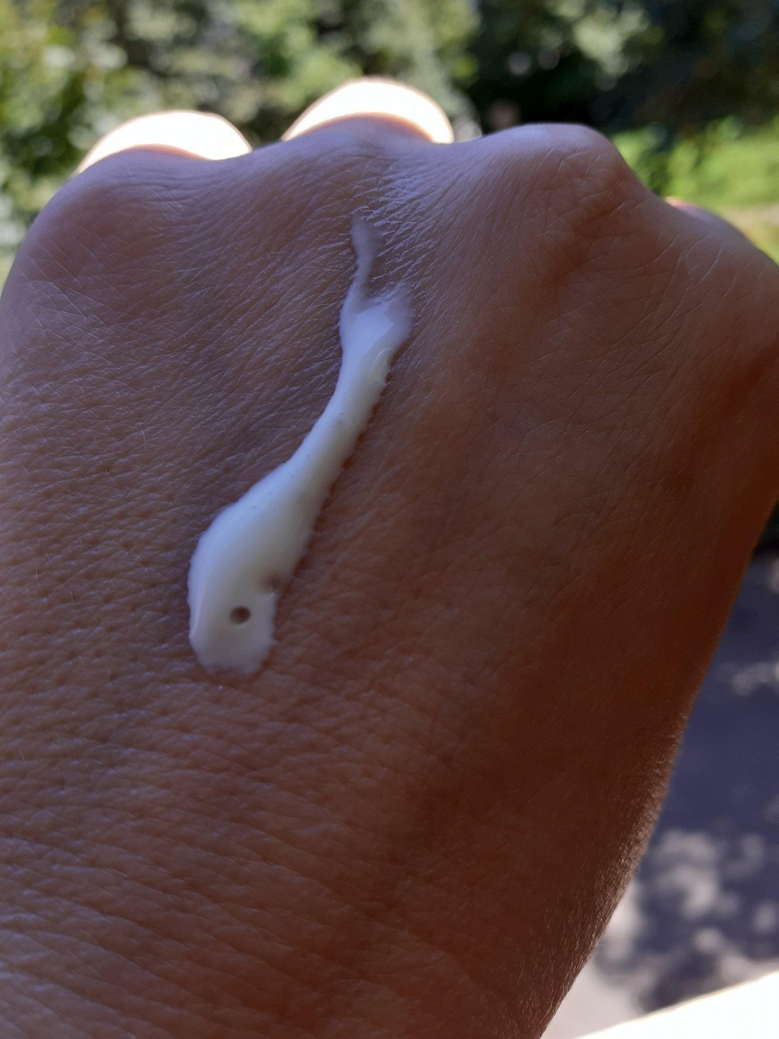 Viola, слънцезащита е с по- лека консистенция от типа на млякото и лосионите, не съм и гледала състава, но мисля, че е химична. Търпи няколко наводнения едно след друго и бързо попива, но пък ако се прекали, както с всичко почва да прави кир ефект. Харесвам я, според мен е ок за кожи без проблем, където не се търсене някакво матиране да има.