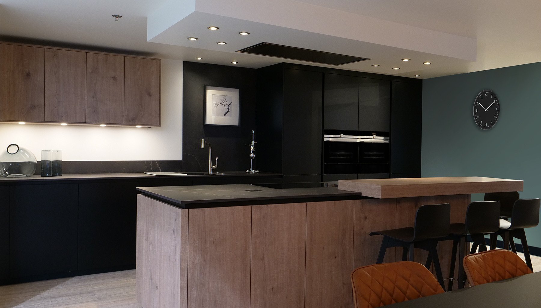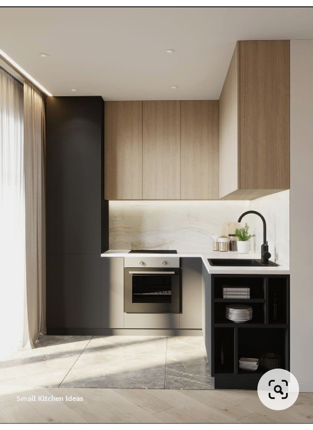 Долни шкафове Графит мат на Алвик(между другото това ми се видя най-надежния мат който не се драска, Perfects sense на Egger си се драска и още как) горни естествен фурнир дъб, кухня без дръжки. Още умувам за гърба и плота. Нещо такова искам да се получи цветово само че моята ще има профил тип Gola под плота и на чекмеджетата