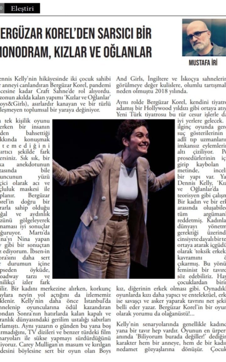 "Зашеметяваща монодрама от Бергюзар Корел Момичета и момчета - "Bergüzar Korel'den çarpıcı bir monodram Kızlar ve oğlanlar" се казва статията от Мустафа Ири в юлския брой на сп. "Нов театър" - "Yeni Tiyatro".