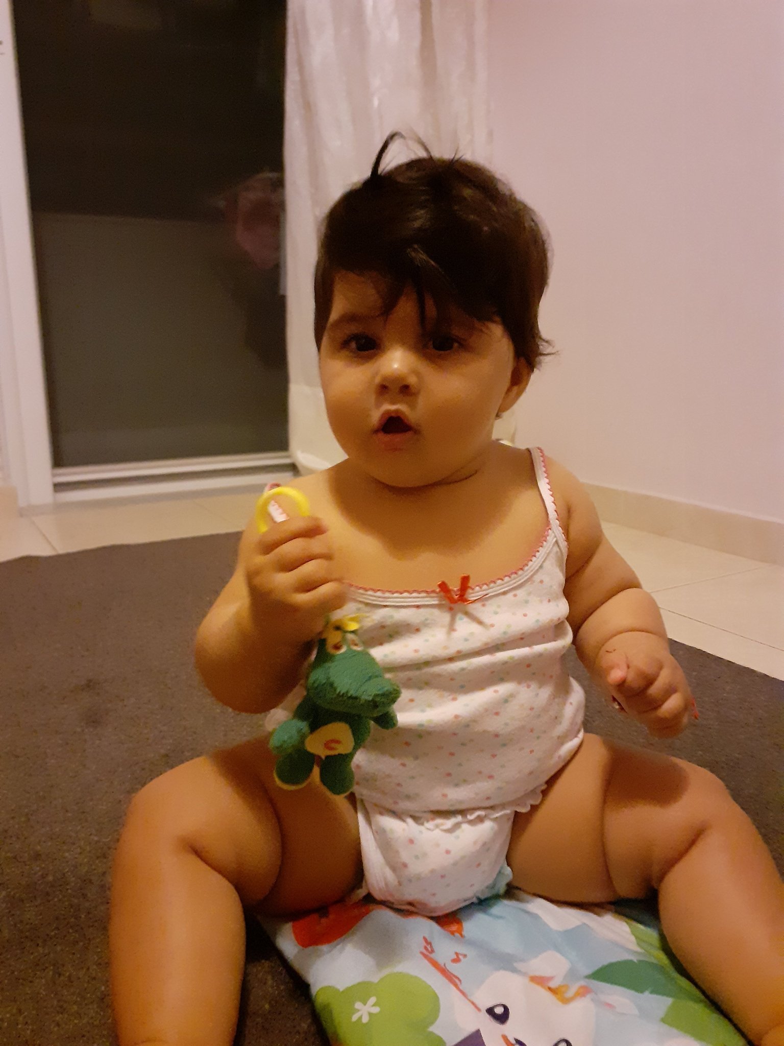 Казва ма-ма,да-да,ба-ба ,га-га и още някоя звуци сумти с нослето,прави физономи.От легнало положение сяда,но не винаги и се получава🤣