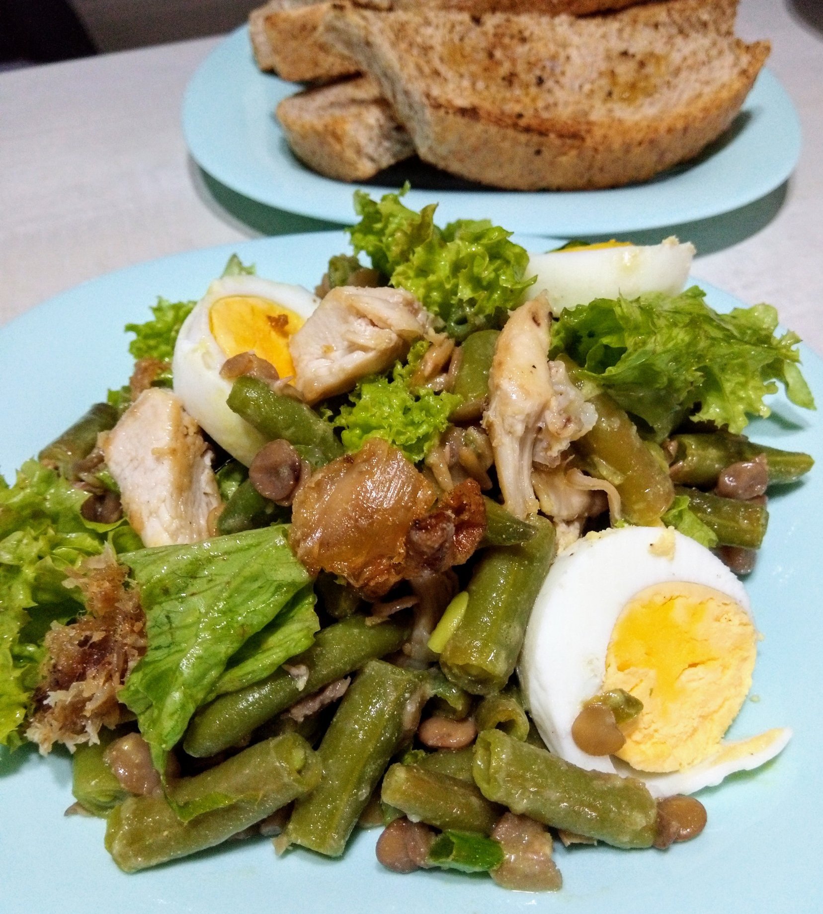 Пилешко, зелен боб, леща и разни други неща, медено горчичен дресинг.