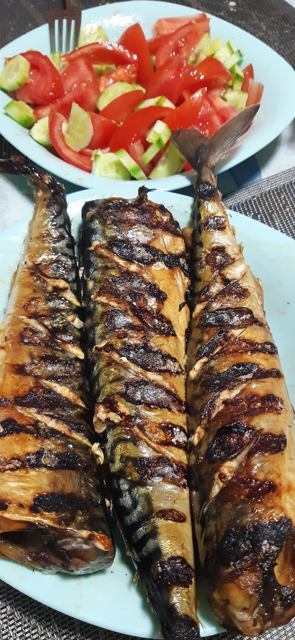 От снощи- скумрия на скара (много обичам, особено когато скарата е на двора).