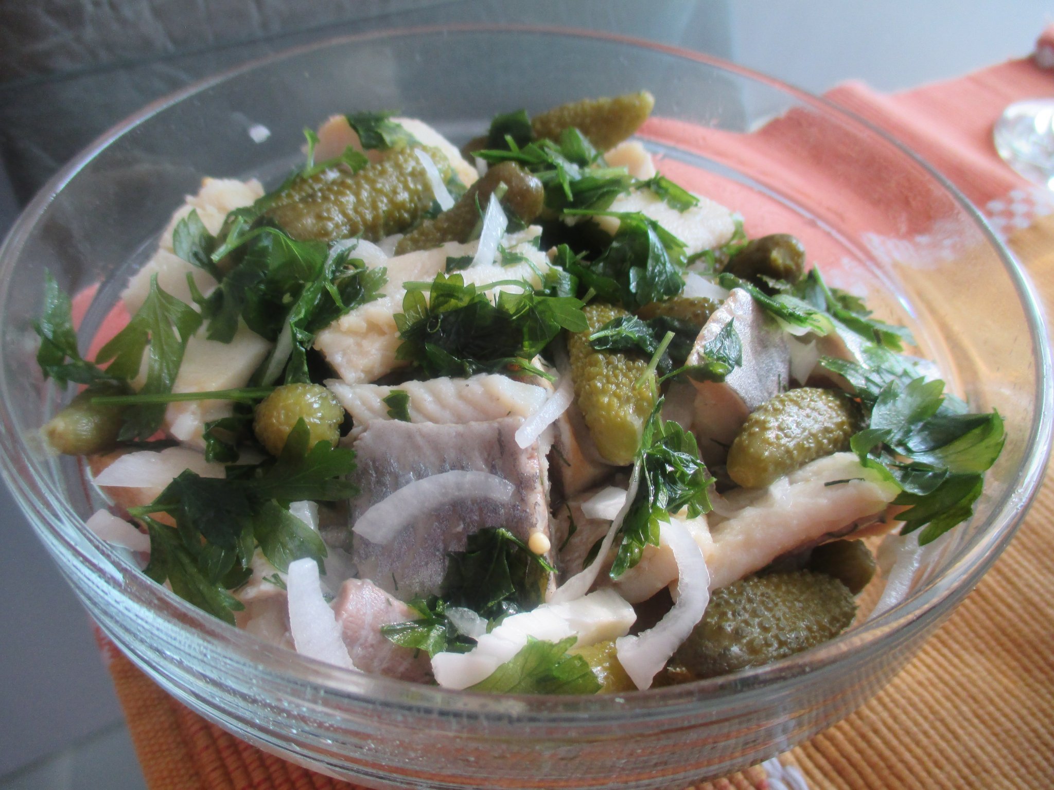 Маринована херинга с бейби краставички, лук и магданоз