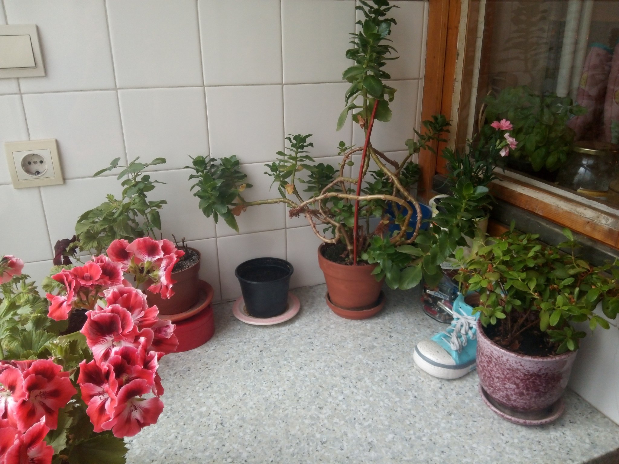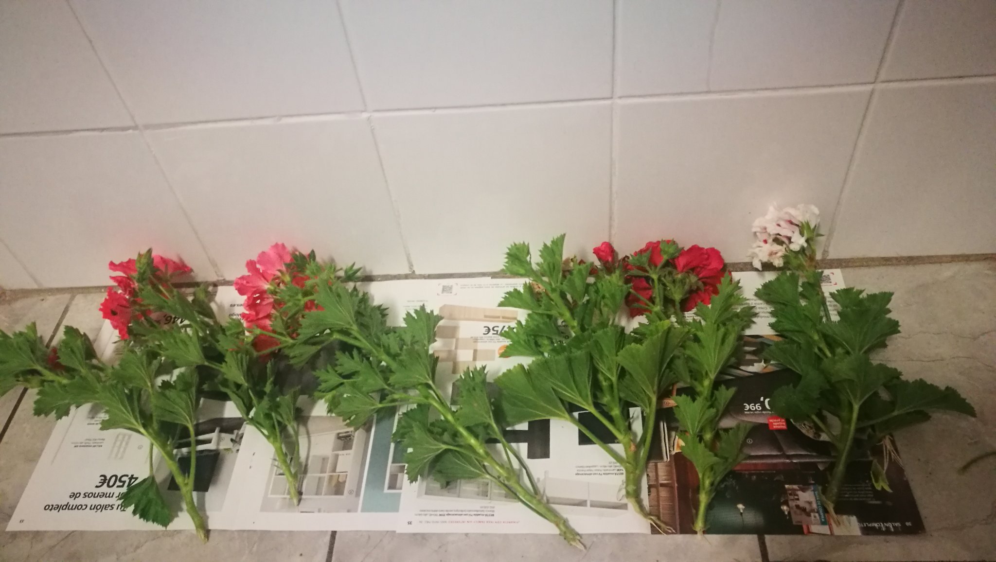 Diorela, ако си мислиш, че днес съм стояла със скръстени ръце, тц, действах аз. Онези малките ги оставям така, да видим какво ще стане. Днес имам нова „реколта”'. Много полезен е линкът, който даде. Сега снимам клонките, преди да правя каквото и да е. Дължината им е между 16 и 30 см. Ще ги нарежа както казваш и ще посадя както казваш. Решена съм този път да разнищя темата с мушкатата, каквото и да става, стига да ме издържиш още малко. Ако може дай инструкции какво се прави след като се вкоренят. Виждам,че се засажат нагъсто, аз съм боднала във високи чаши, пластмасови, по едно. Ако са две примерно после как се разделят и на какъв етап от растежа? Дано не съм нахална вече, ама така силно искам да имам кралски мушката. Ето и снимката.