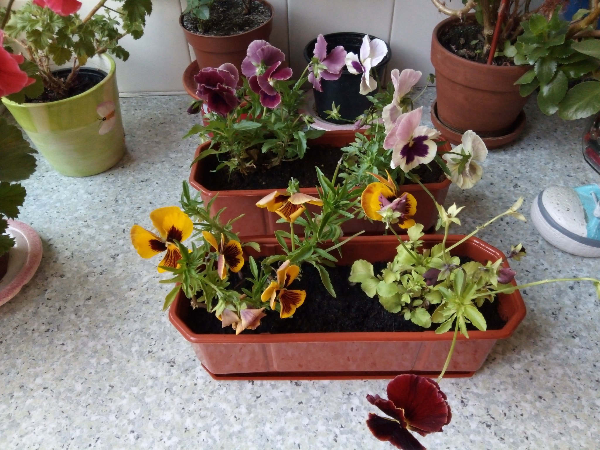 На откритите тераси имам петунии, но са съвсем прясно насадени и не съм ги снимала още. Пролетта сях и калдъръмчета от семена, но са съвсем малки бебета още. Не знам защо не вървят - студено ли им е, що ли? Тези на вилата вече са много гъсти и големи, а моите приличат на бурени. Дано да се стопли най-накрая това време и да живнат.