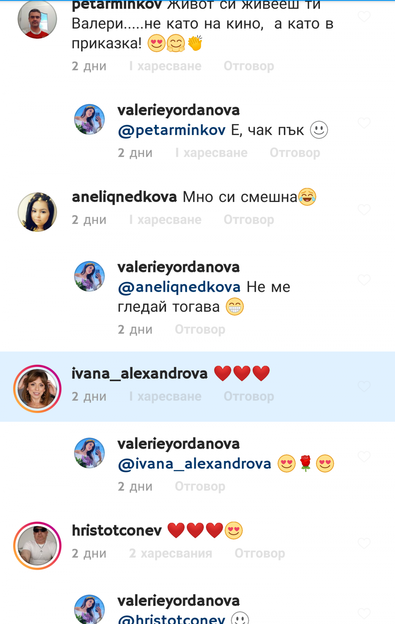 Понеже си помислих, че може да са роднини на Валчето, мазохистично отворих профилите на въпросните господа, за да погледна дали Кралицата ги следва-ами не. Чак тогава публикувах поста. Макар да е доста лудичка, изглежда на човек, който държи на семейството си и неведнъж е показвала свои роднини. Най-малкото щеше да ги последва в инстаграм. Постът ми е публикуван, защото ми хареса серията от коментари, която се е подредила в редичка, показваща разнообразната аудитория, до която е достигнала Валчето и ми се стори забавно.