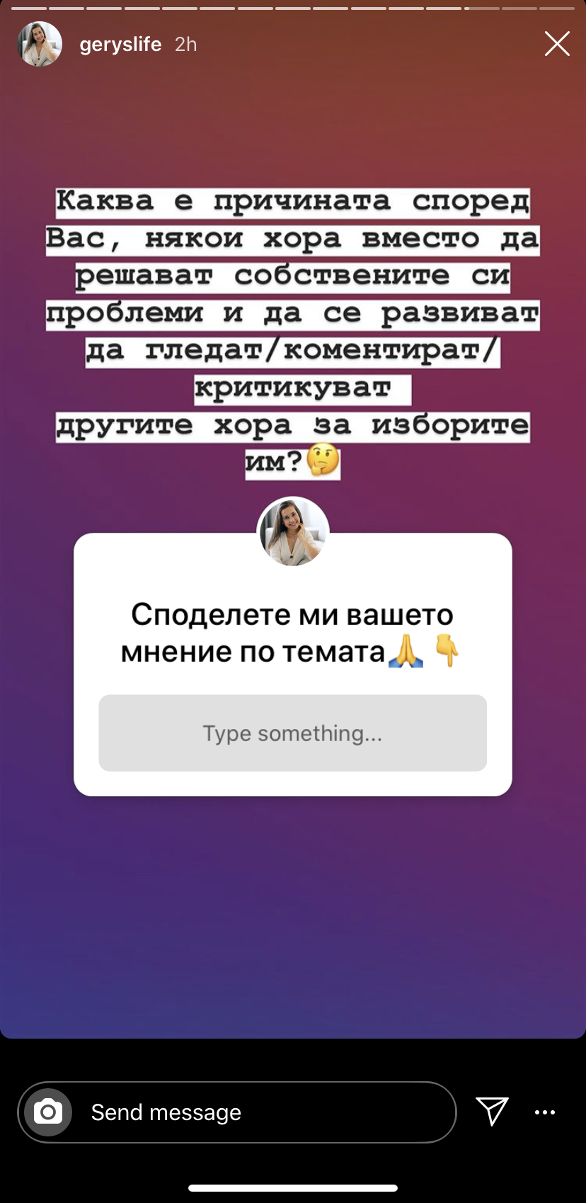 Тя Гергана поне на облечени снимки ги пише, инстаграм кифлите тези мъдри мисли обикновено на разголени и вулгарни снимки ги прикрепят, на Валери Божинов сръбската приятелка е една от тях. На тази снимка не е съвсем лоша.