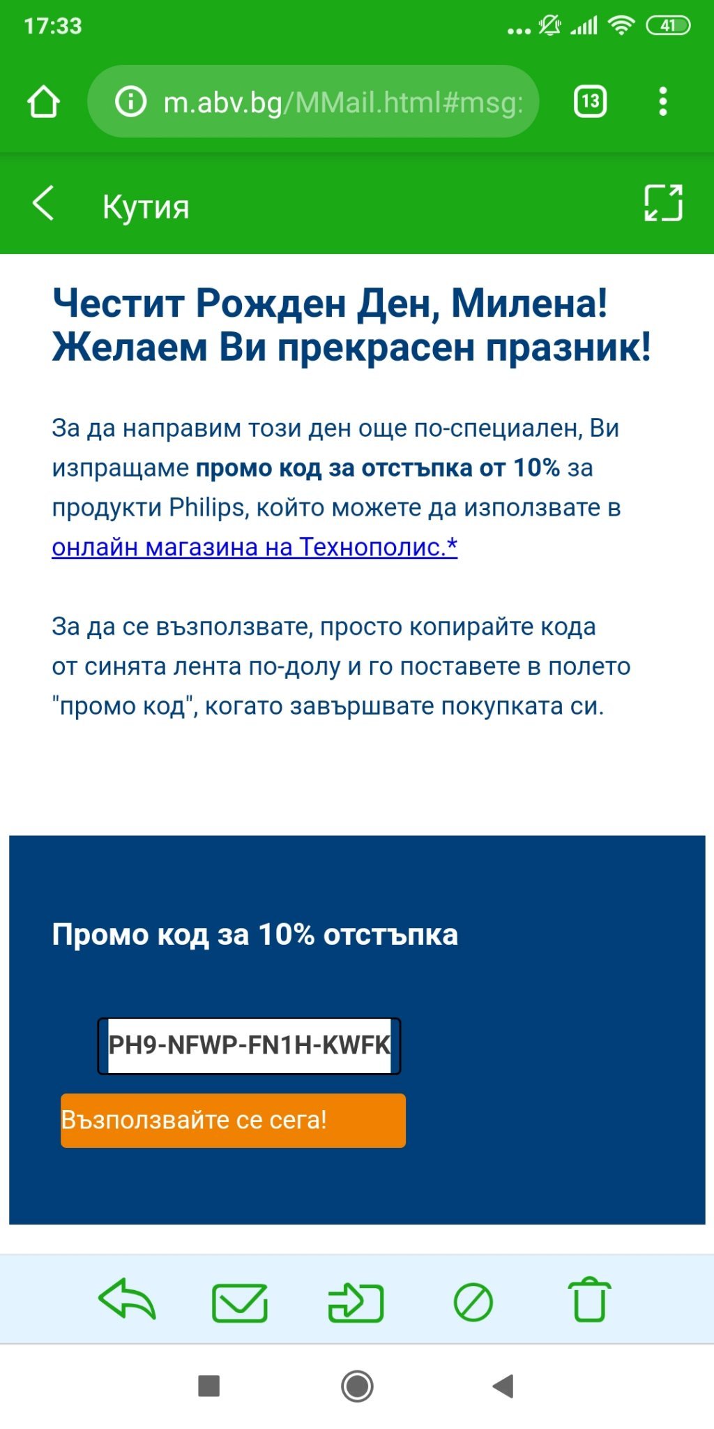 Имам регистрация в сайта им и тези дни получих имейл, че ако си напиша кога ми е рождения ден, ще ми пратят код за отстъпка 10% като подарък. Ако ти върши работа се регистрирай и напиши една близка дата. Simple Smile