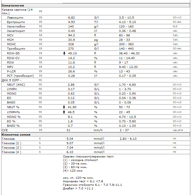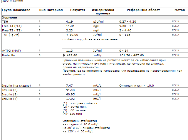 Отидох при друг за второ мнение. Той погледна резултатите и каза, че е било напълно излишно да се мери КЗ и инс на 30' и 60'  Всичко, което ги интересувало ендокринолозите било на 120' Каза да взема селен, глюкофаж 2х500 и да дойда след 2м. Не коментира Вит Д...