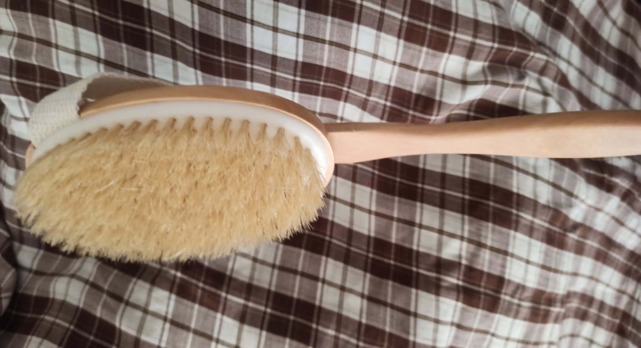 Може ли снимка на тази четка, че да не купя нещо друго. Ако е с дървена основа и естествен косъм като някогашна четка за баня, моля, просто потвърди, за да не се занимаваш със снимка. Благодаря предварително!