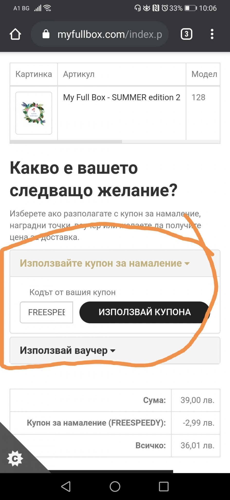 За My Full Box кода за отстъпка до офис на Спиди в бележките към поръчката ли се пише?