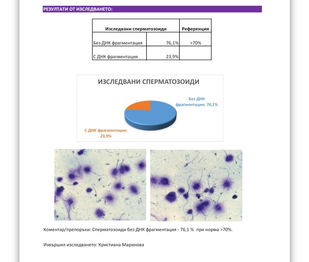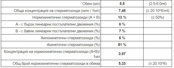Излязоха му резултатите: Сперматозоиди с фрагментирана ДНК (%)- 41 %, Сперматозоиди с нефрагментирана ДНК (%)   - 59 %. Mорфология 3% (на предните две спермограми с морфология резултатите бяха 2% и 1%). Останалите показатели: