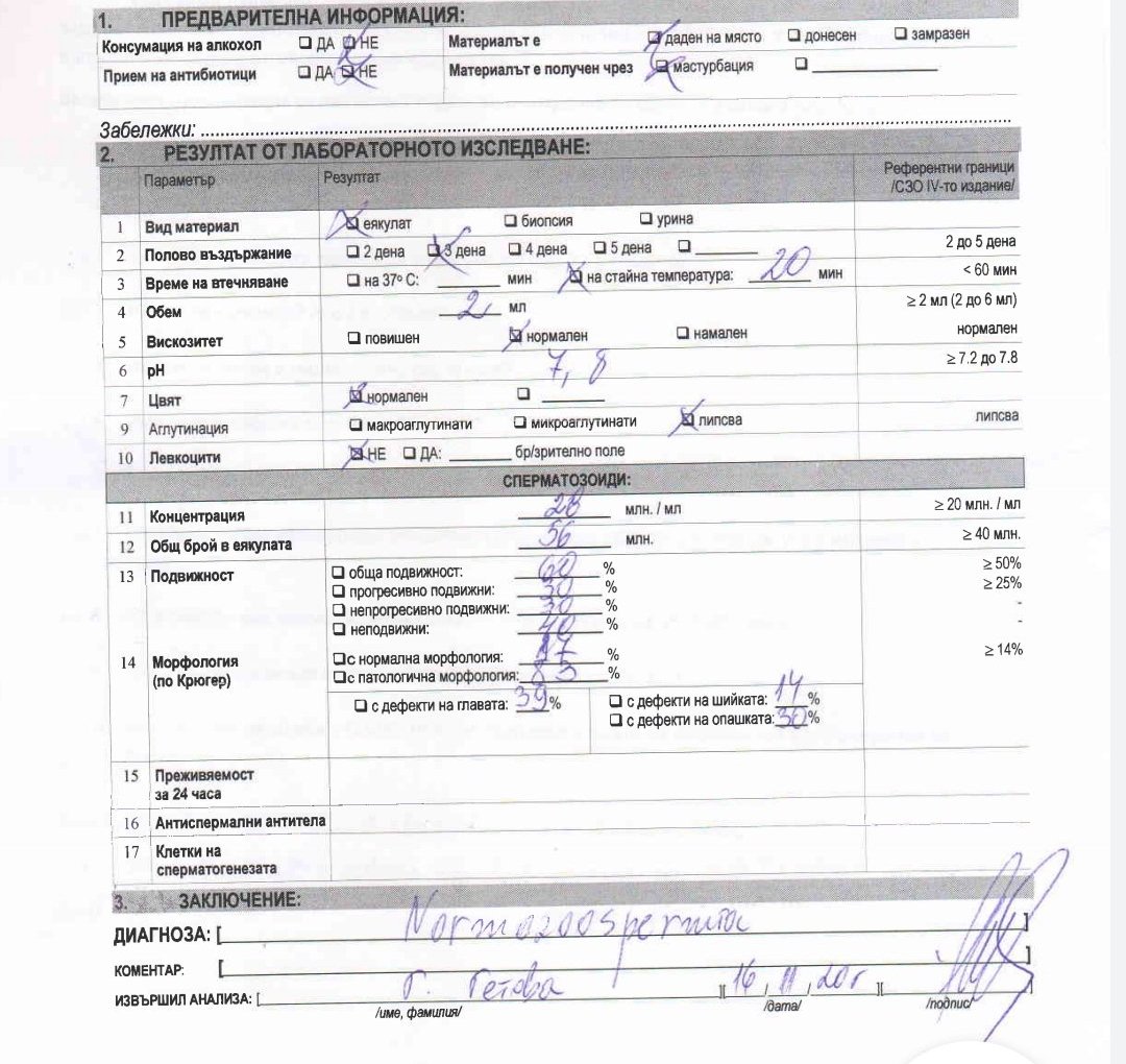 Здравейте, момичета. Може ли мнение за спермограмата на ММ. Има ли надежда за естествено забременяване или направо инсеминация?