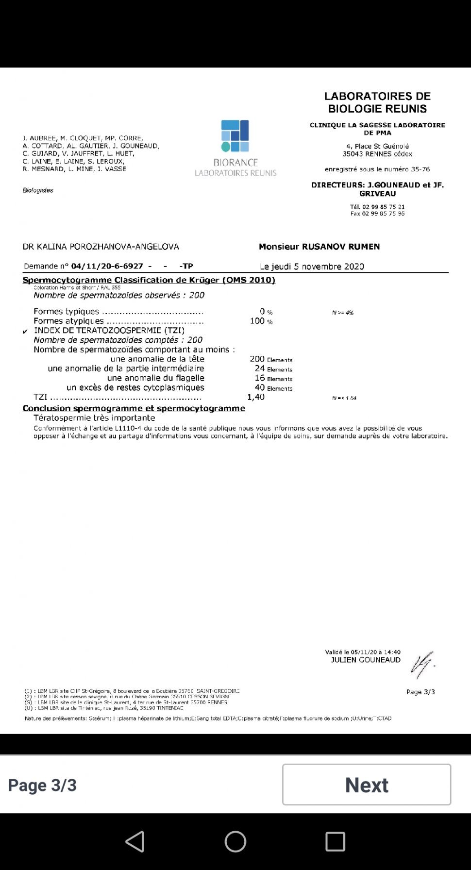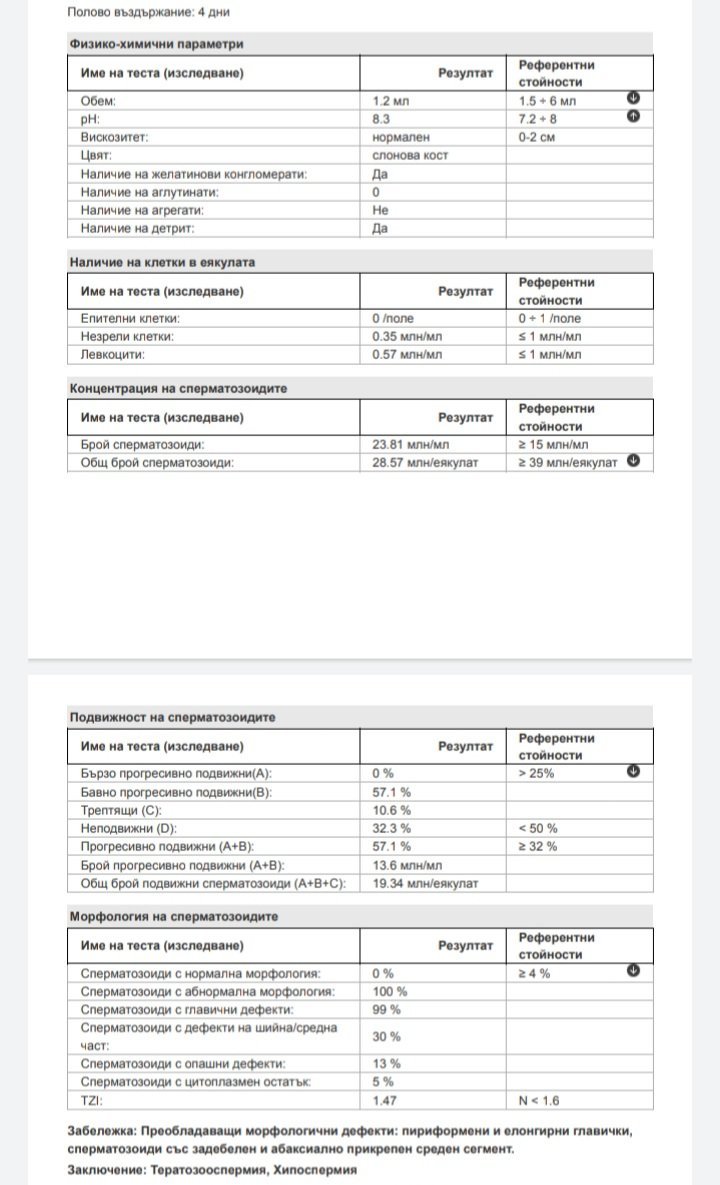 Здравейте, след една година опити за забременяване имам 1 спонтанен аборт и след още една година ходене по мъките, пиене на всякъви добавки и отвари разбрах, че аз нямам никъкъв проблем следователно моят мъж си направим спермограма, която се оказа доста лоша, моля да си дадете мнението, междувременно чакаме за лечението на инфекция, която не мога да кажа колкото и несериозно да звучи, защото когато ми се обади гинеколожката аз просто бях във шок, докато ми обясняваше колко е зле положението.. Надявам се да не е проблем, че пише на френски! Моля за вашите мнения имаме ли реален шанс да бъдем родители! ❤️