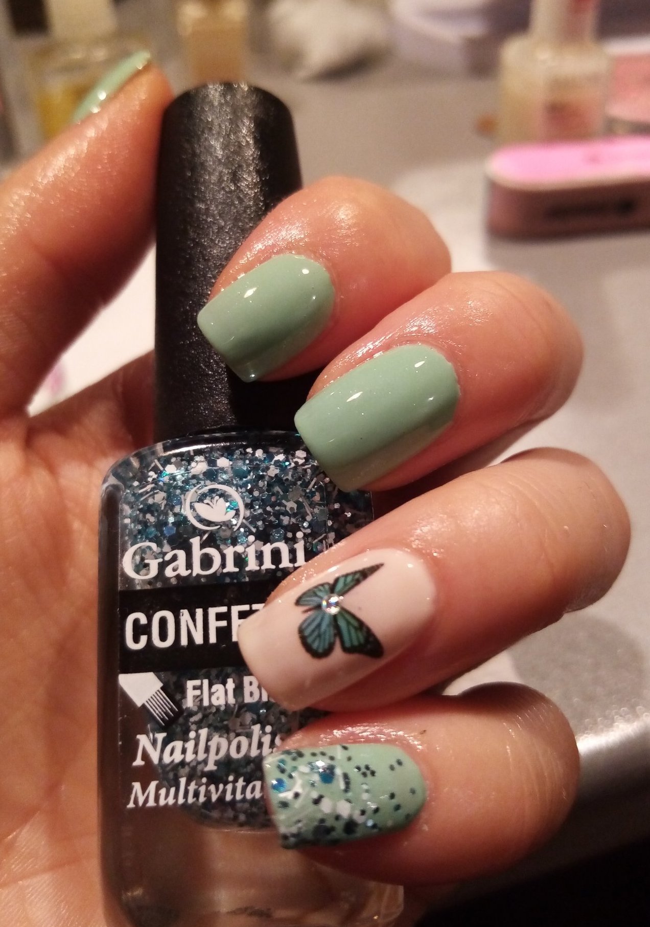 Lemy , AraBesqUe лакчето е на Masura- Emilia. Не знам защо на снимките из нет-а изглежда толкова светло син, в действителност е почти като на моята снимка, но и телефонът променя малко Simple Smile Декорацията е печат-личи си по размазаното накрая Grin