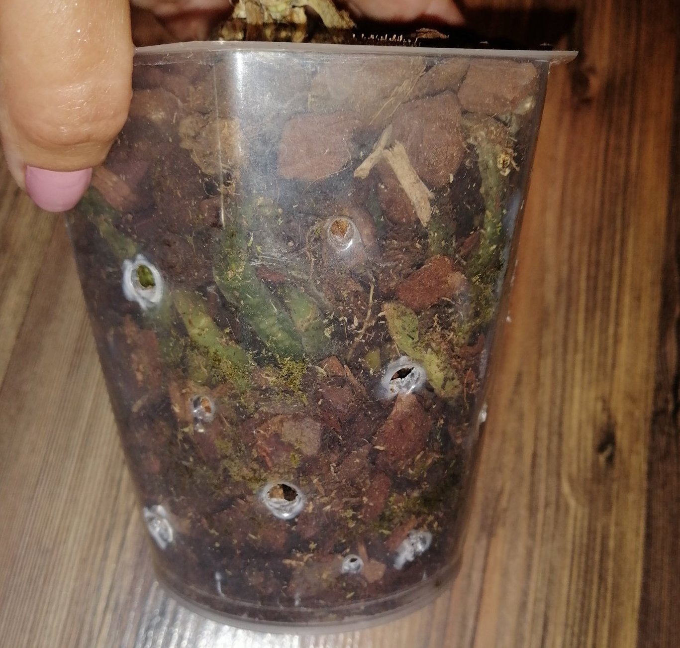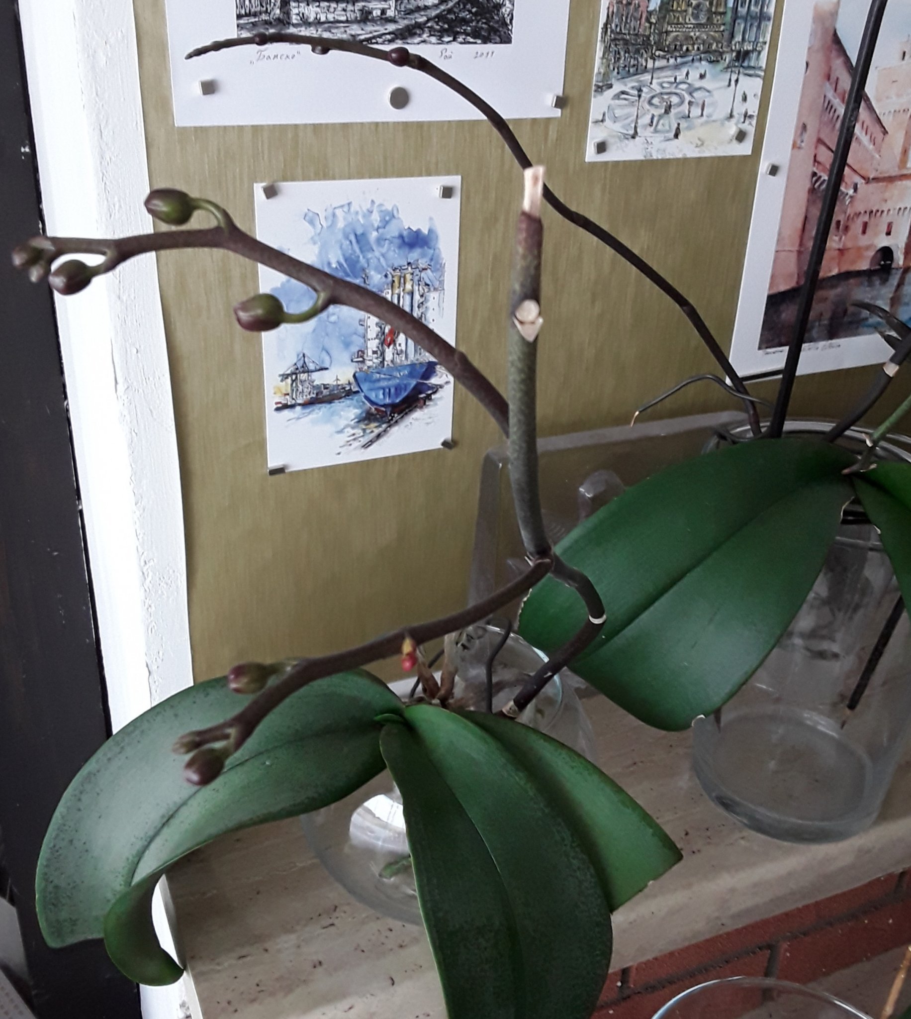 Момичета, дайте мнение. Тази орхидея цъфтя през зимата, после почива, сега направи пъпки от разклонение на стария цветонос.  Най-долната пъпка изсъхна, останалите изглеждат наред. Кафявото по корените са остатъци от канела, ръсих през зимата защото имаше почерняване в основата на корените.