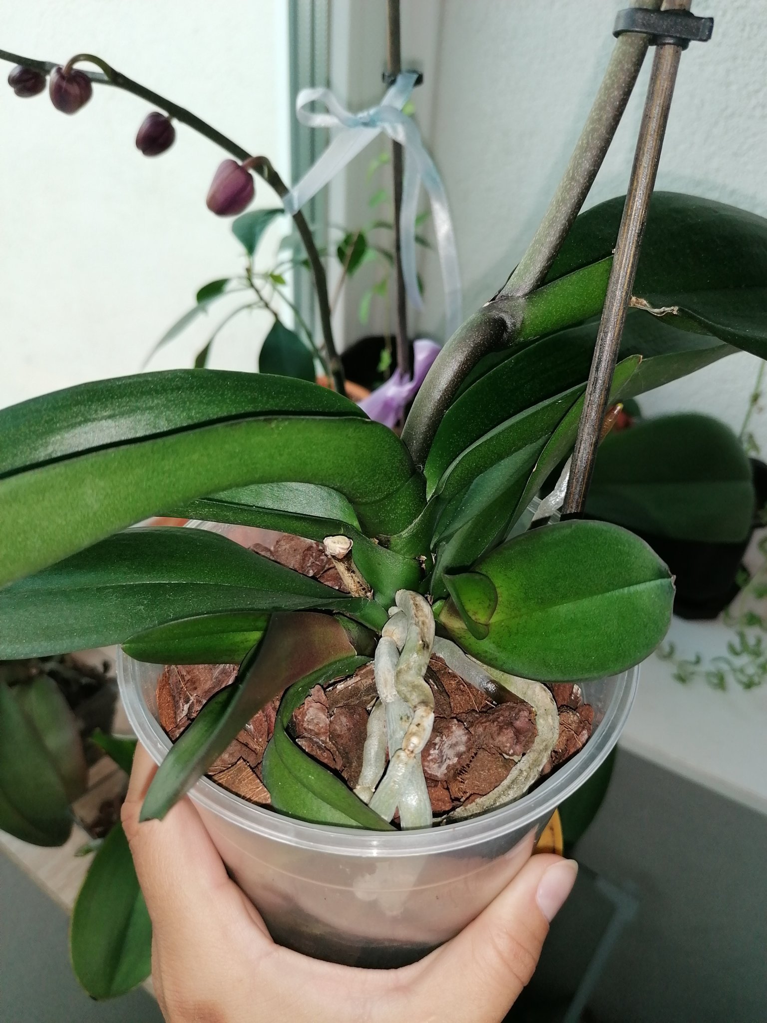 Ако корените на орхидеята са загнили, препоръчително е да изрежете изгнилите части и да ги обработите с фунгицид. След това можете да я пресадите в нов субстрат, като изплакнете корените под течаща вода и ги проверите за повреди. При пресаждането е важно да бъдете внимателни с крехките корени и да ги обработите на отрязаните места с канела. Ако вашата орхидея е пожълтяла, но има здрави корени и развива нови издънки, препоръчително е внимателно да я извадите от саксията, да почистите корените и да смените коритото и саксията. За да помогнете на растението, можете да го пресадите в по-малки саксии с намалена розетка, което ще позволи на младите листа и корени достъп до влагата. По-малката саксия също ще допринесе за уплътняване на пространството и предотвратяване на развитието на корените. За възрастно растение е нормално да има много (и големи) листа. Ако откриете изгнили корени върху вашата орхидея, препоръчваме ви да я пресадите в нова саксия с подходящ субстрат за орхидеи. Отстранете напълно изгнилите корени и използвайте фунгицид като Топсин, за да предотвратите по-нататъшно гниене. Оставете корените да изсъхнат преди пресаждането и продължете да я отглеждате, като поливате веднъж седмично.