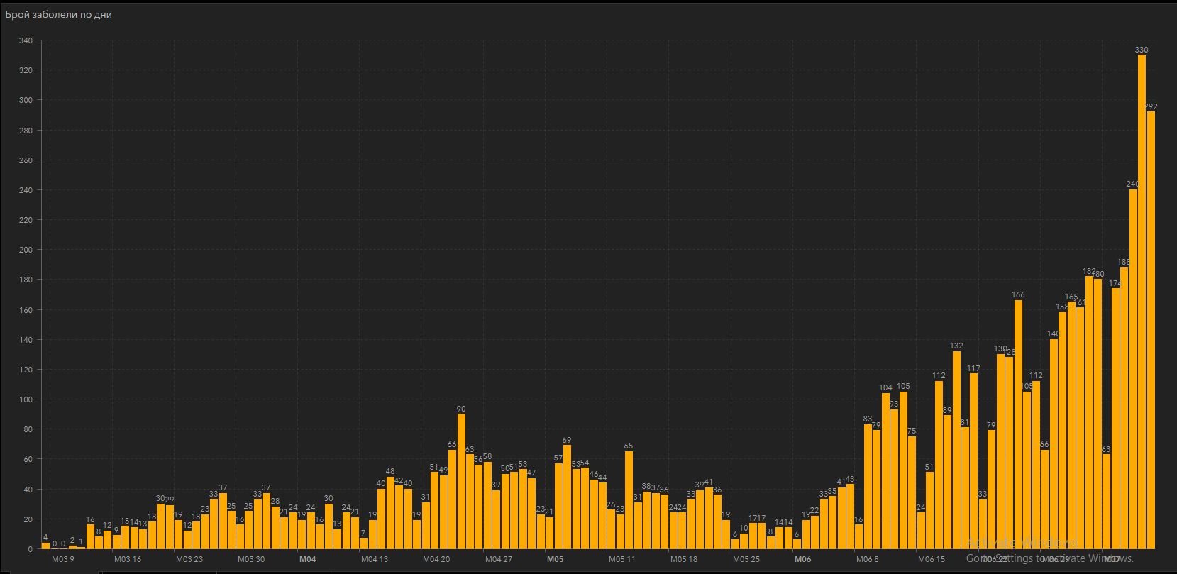 Въпреки малко по-ниския резултат от вчера като цяло растежът продължава ,  което е съвсем ясно видимо на графиката. Има дни с повече и дни с по-малко, но средно посоката е стръмно нагоре. Накрая на тази седмица вече сме трайно около 300 (а мислехме, че ще бъде 200), ще видим другата седмица какво ще става.