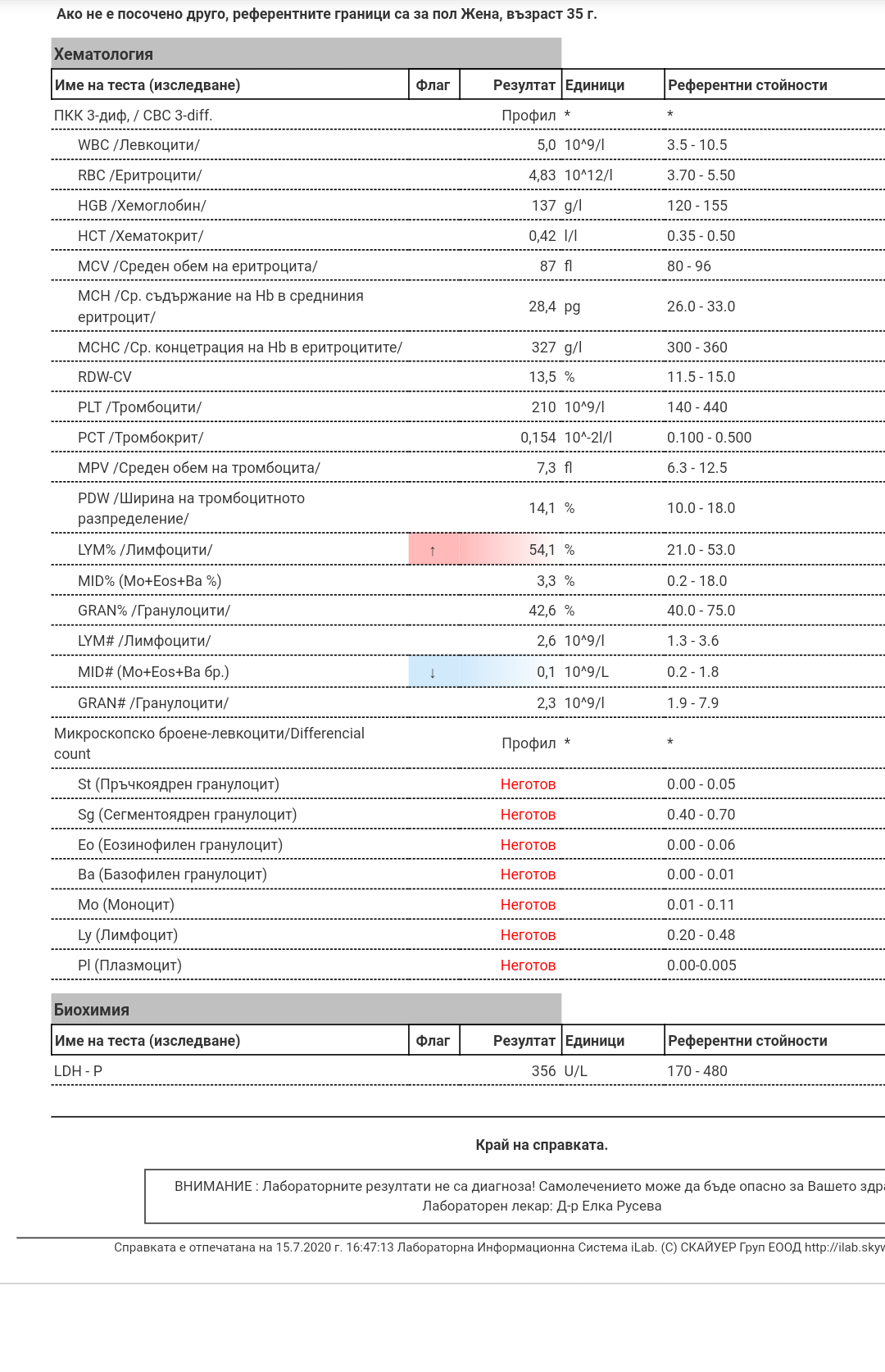 Понеже не съм очаквала лл да ми се обади и да ме прати на пулмолог днес, аз на своя глава отидох сутринта в лабораторията и си пуснах отново кръвни. Еми, познайте какво се вижда сега, една седмица по-късно: лимфоцитоза!
