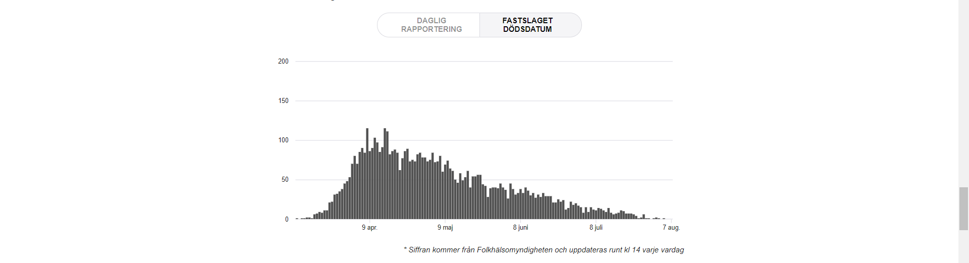 Та затова тук в Швеция се водят две смъртни статистики - едната с докладваните случаи за деня, другата е с точната дата на смъртта. Крайната цифра и в двете статистики е една и съща, но втората статистика дава точна информация как се движи кривата на смъртта. Както се вижда в първата статистика има празни дати, т.е. без докладвани смъртни случаи, в събота и неделя.