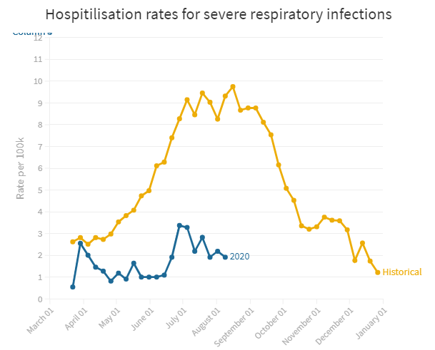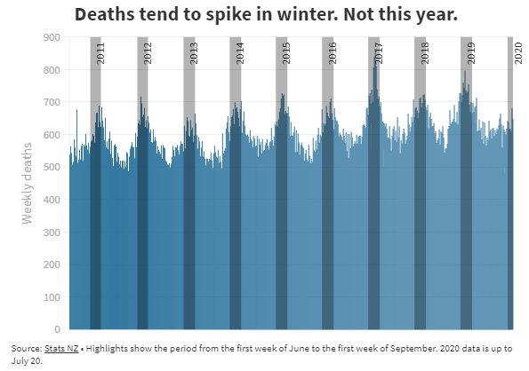 Смъртните случаи обикновено отчетливо се повишават през зимата, но не и тази зима. Сега те са на същото ниво както през лятото, въпреки че обществото в Нова Зеландия отдавна се е върнало към стария нормален начин на живот. Има няколко предположения защо това е така. Едното е, че локдаунът освен коронавируса е спрял и един куп други вируси и болести от циркулация, другото е свързано с чистотата на въздуха, която също се е повишила. По това време на годината през 2019 година смъртните случаи са били 4 пъти повече, а през 2018 година 6 пъти повече.