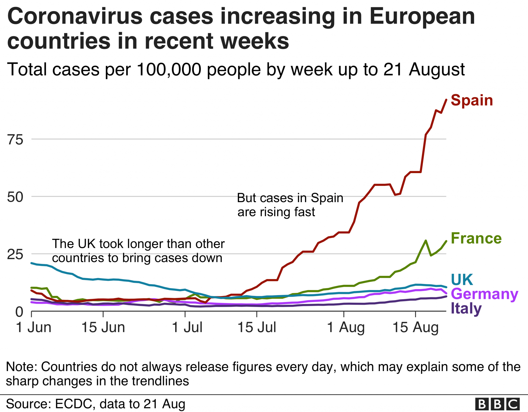 Към 22 август Обединеното кралство регистрира 21,5 случая с коронавирус на 100 000 души през последната седмица, според Европейския център за превенция и контрол на заболяванията.