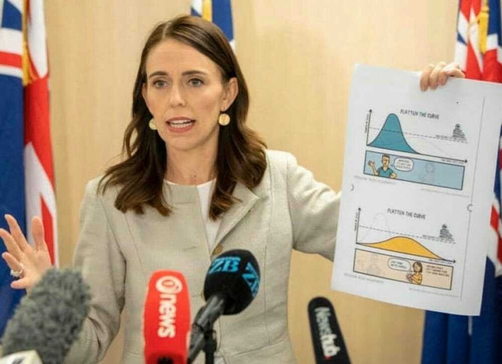 Премиерът на Нова Зеландия Джасинда Ардерн с графика за изглаждане на кривата. Нова Зеландия не просто изглади кривата, а я изправи напълно и я занули.