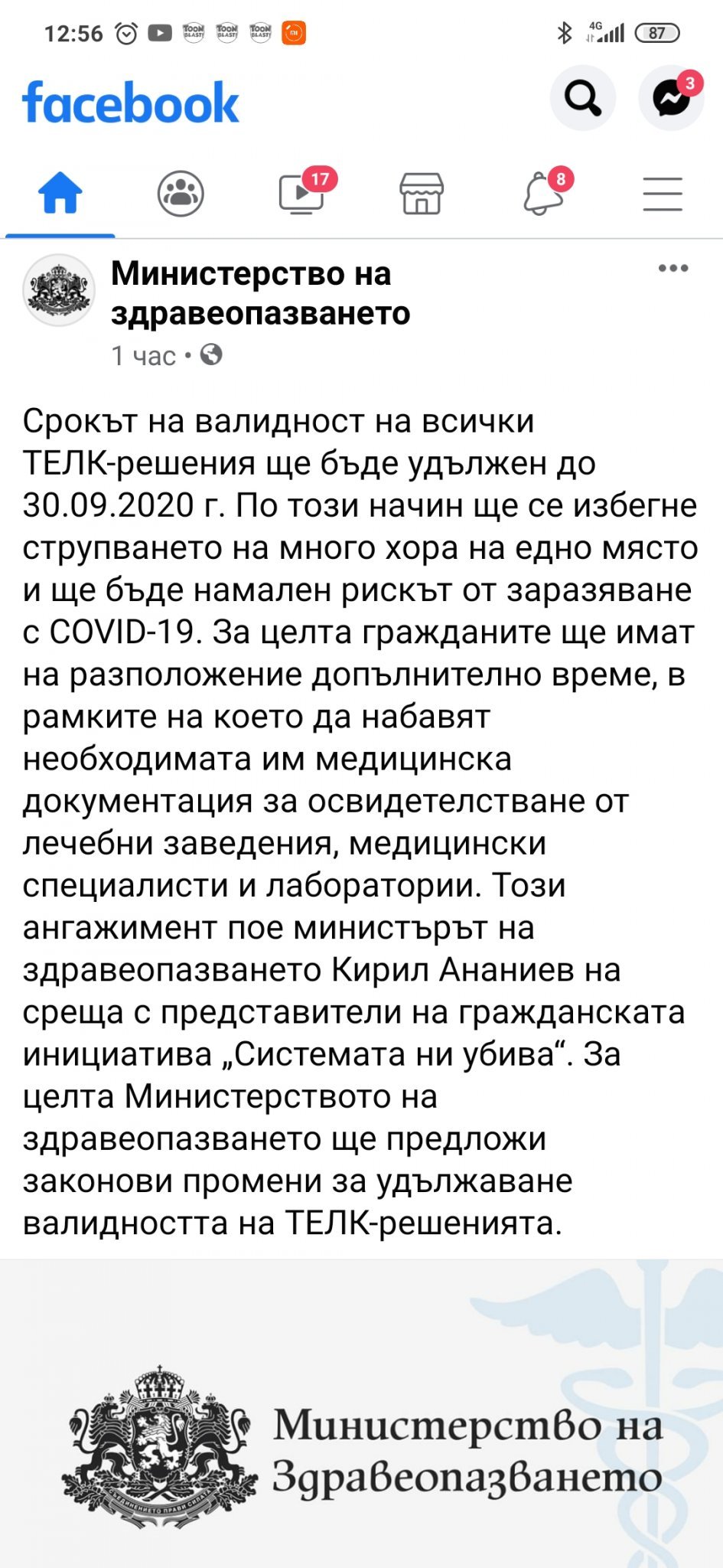 Научих от председателя на телк- София, че майките на деца с увреждания са предложили да се продължат телк на всички за срок от 2 месеца след отмяна на извънредната ситуация. Тъй като съм пряко засегната, защото ще ми излезе решението в началото на юли, ще следя дали ще го одобрят и най-важно кога. Ще информирам в темата. В момента телк си върви, което е пълно безобразие, обикаляме болници и лекари.