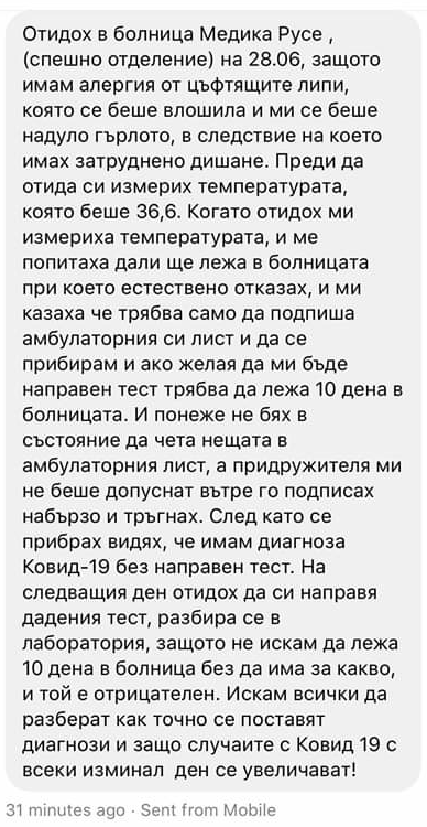 Абитуриентът с COVID-19 от град Бяла, който бе приет за лечение в русенската болница „Медика“, е имал само главоболие в навечерието на бала си във Велико Търново на 27 юни. Момчето не е предполагало, че може да се е заразило с опасния вирус и смятало, че главоболието му е в резултат на вълненението от предстоящото събитие, затова медиците определиха като некоректни и грозни обвиненията срещу младия човек. В деня след бала абитуриентът се почувствал отпаднал, което пък си обяснил с безсънната нощ заради тържеството. Едва в понеделник - на 29 юни, получил болки в гърлото, суха кашлица и висока температура. „Неговата сестра, която е студентка по медицина в Германия, го посъветвала да си направи тест за коронавирус, който се оказал положителен“, обясни доц. д-р Маринова.