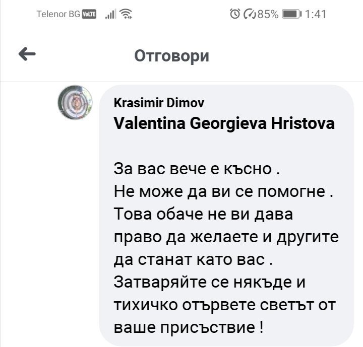 Ето това ми написа един господин във ФБ страницата на МЗ. То показва мисленето на много голяма част от хората. Поне сред моите познати си правих статистика на око малко, но 80 процента от тях биха ме пратили точно там, защото смятам, че барове, дискотеки и мачове трябва да затворят, маските да се носят правилното и задължително и да не се събираме в големи групи: