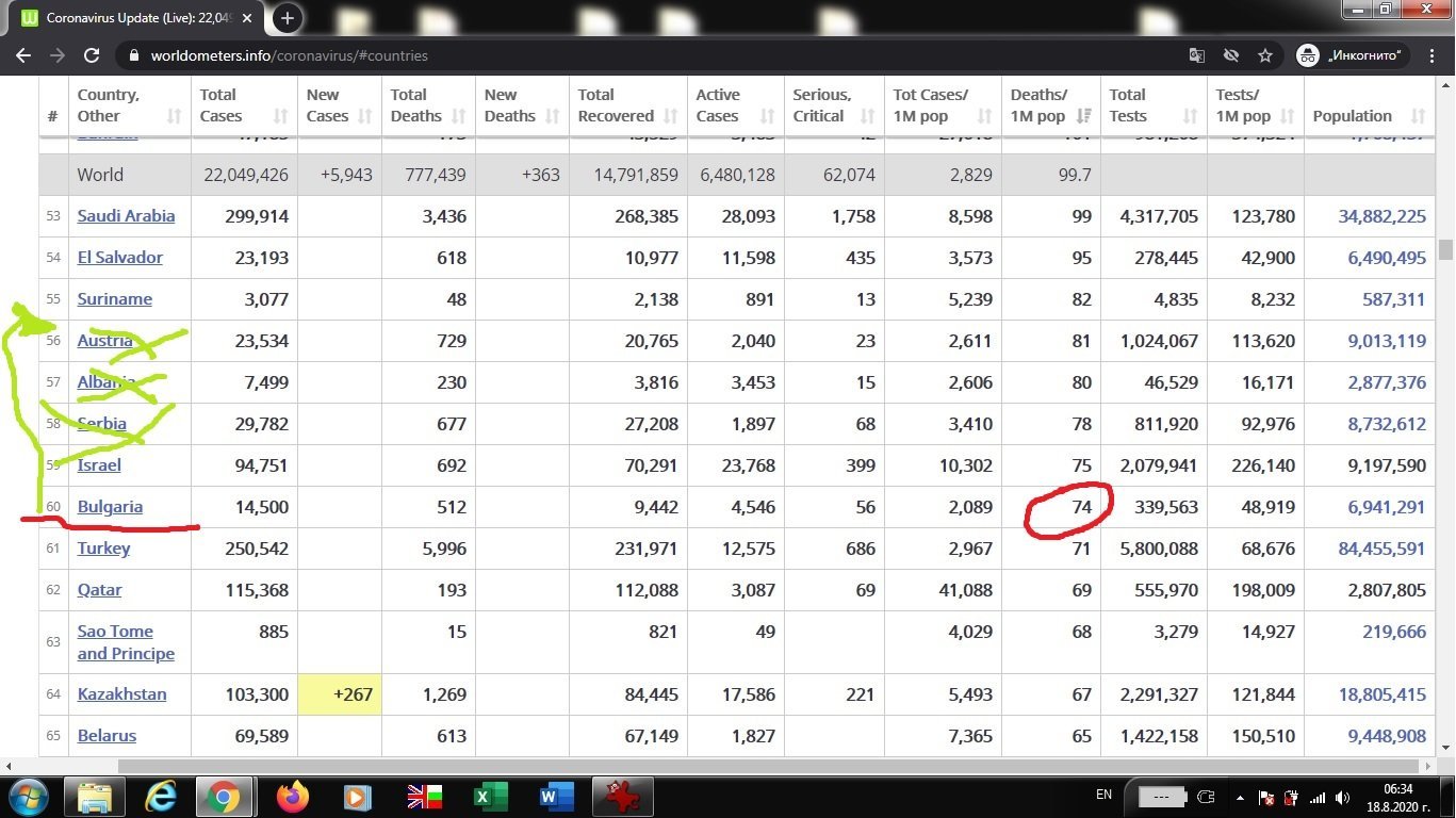 2 седмици от днес - > на 02.септември сутринта , ако ние -БГ , не сме изпреварили Сърбия, Албания и Австрия по критерий  deaths/1Mln of population       ->  https://www.worldometers.info/coronavirus/