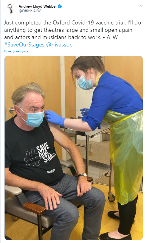 Току що взех участие в изпитване на Оксфордската ваксина срещу Ковид-19. Ще направя всичко възможно за да могат всички театри, малки и големи, да отворят отново и всички музиканти и актьори да се върнат обратно на работа.