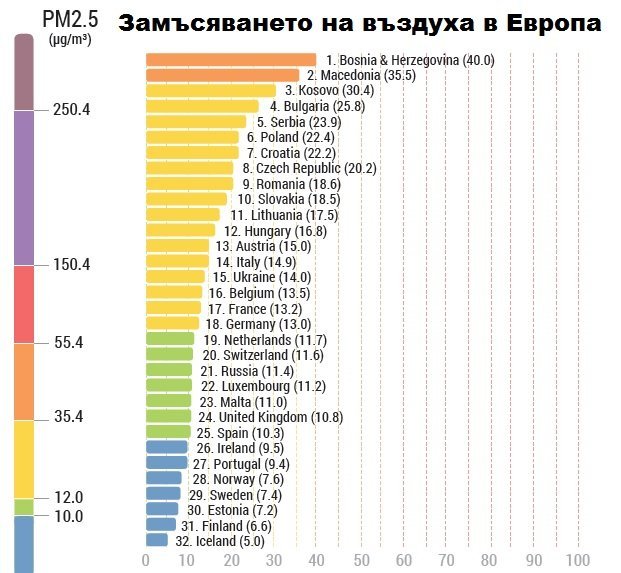 Най-чист е въздухът, под пределните норми на СЗО в следните европейски страни - Исландия, Швеция, Финландия,  Естония, Норвегия, Португалия и Ирландия.