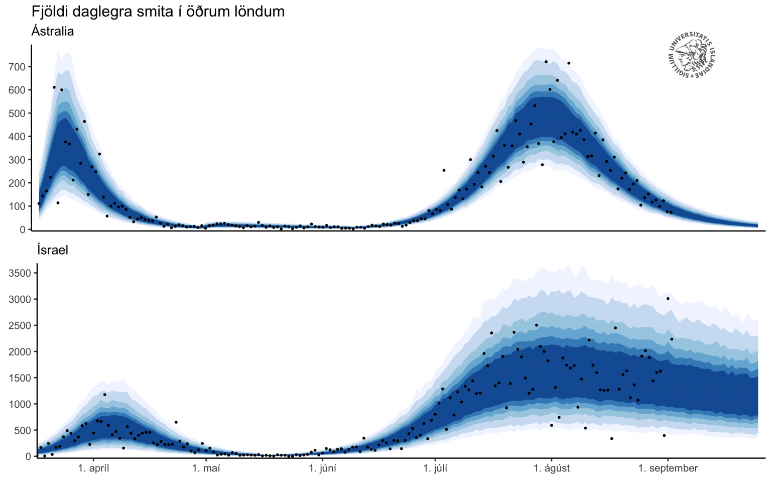 Ето това е математическият модел на развитието на епидемията в Исландия пролетта и сега. Сините нюанси са интервалите на доверителност. Най-тъмният е 95%, най-външният светъл - 60%.  Горната графика е на дневните случаи - пролетта и сега лятото. Черните точки са реалните дневни случаи. Втората графика отчита промяната в коефициента на репродукция. В момента е под 1, но е стигал вероятно стойности около 3.