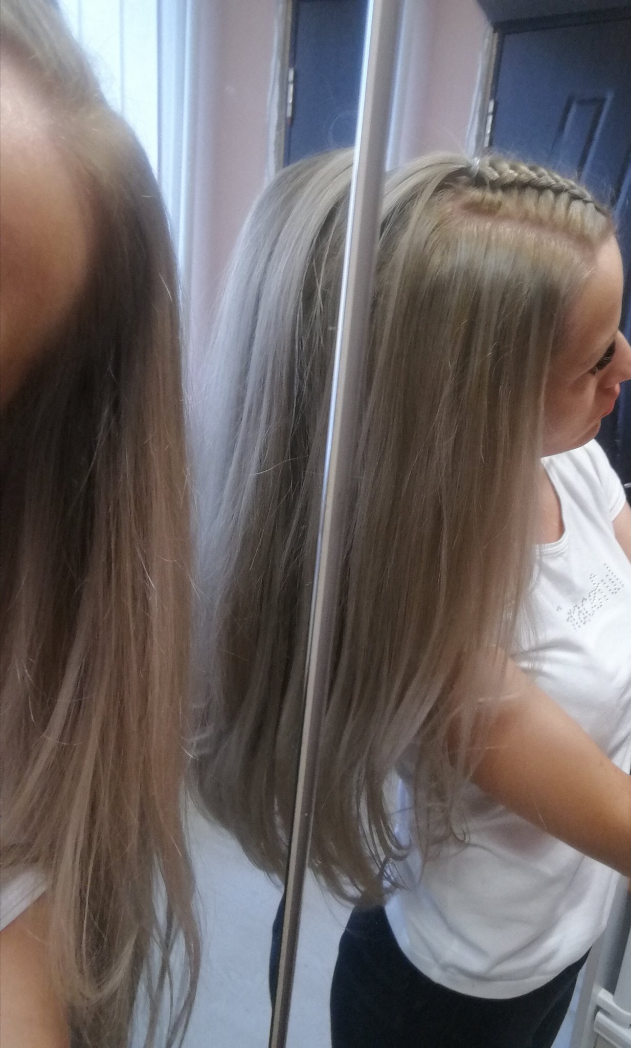 резултат от Селектив смес 1000 и 1011 с изсветляващ коректор cs . Коренът стана жълт горе-долу като след блондор, много трудно се неутрализира с матирането и за съжаление има разлика корен-дължини, защото те ми бяха много матирани поради предишното неуспешно боядисване вкъщи с Гарниер. На снимките, естествено не личи така,както е на живо. Следващите 3-4 седмици изобщо няма да матирам,за да се отмие колкото е възможно и ще видим как ще стане