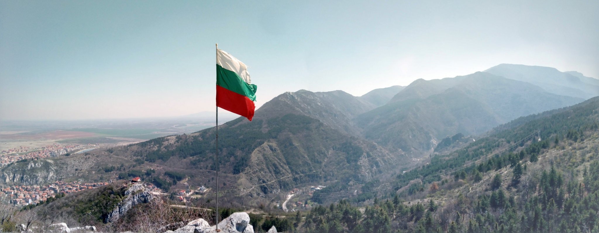 Панорама от върха, самосглобена от гугъл асистента, тел ми не прави добри снимки Simple Smile  Мястото на колата се вижда вдясно - където визуално свършват жиците, а параклисът е вляво на хълмчето Simple Smile
