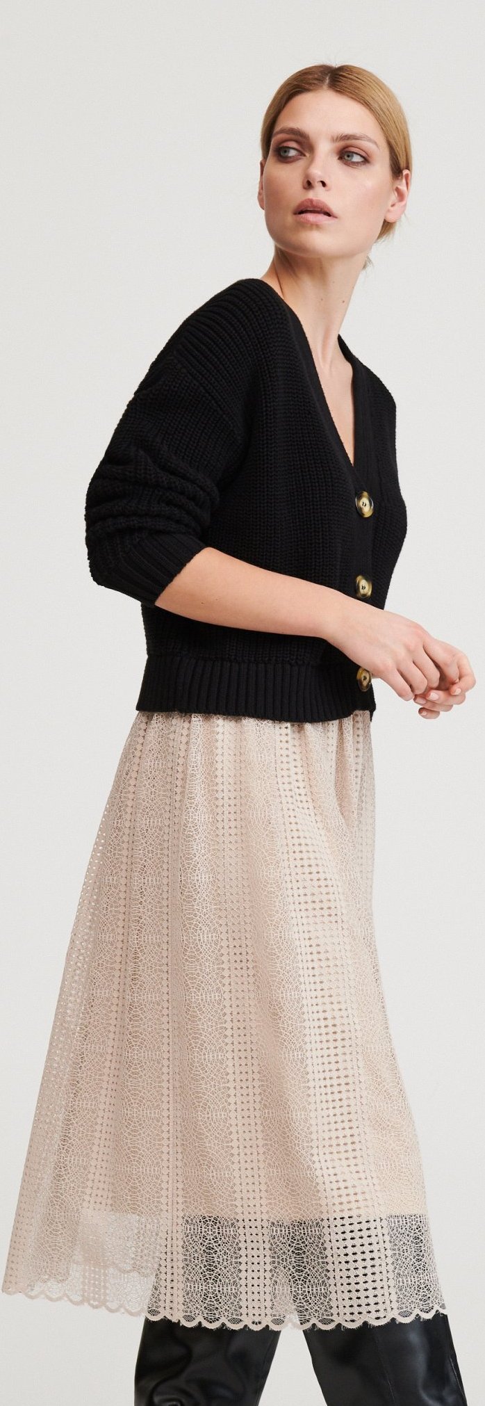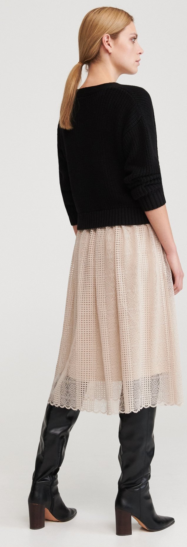На мен полата ми е определено пролетно - лятна и ми е странна съчетана с ботуши и жилетка, но ми прави впечатление, че явно така е модерно. Бих сложила нещо цветно -  сандали, или обувки в убито зелено например. Определено я виждам комбинирана цветно. Нагоре не знам, може би танк топ, но всичко зависи от това къде ще я носиш. Дори и с късо кожено яке бих я комбинирала лично аз.