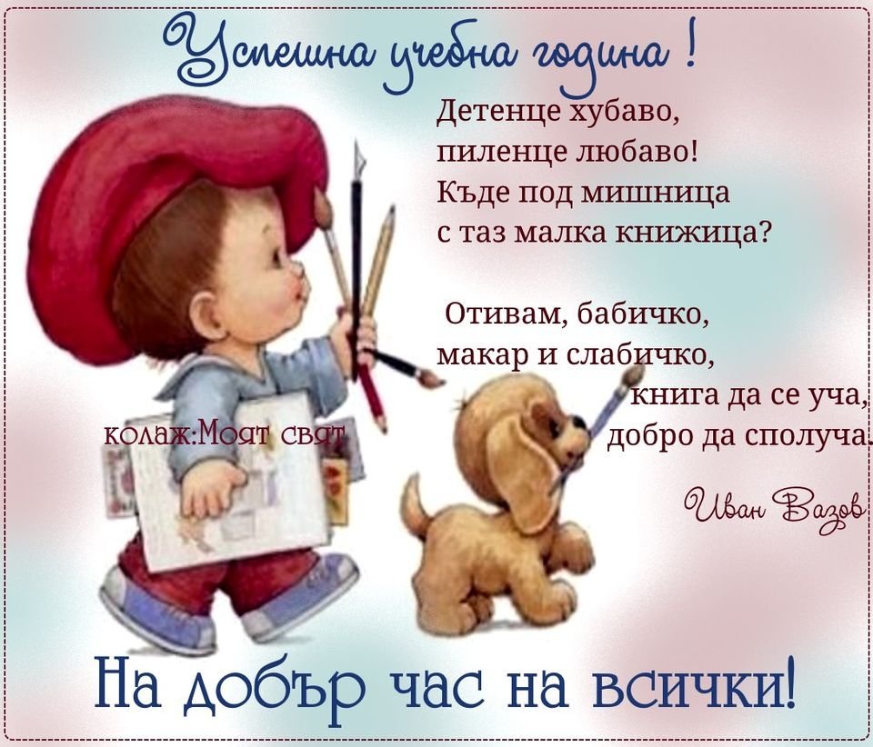 Да е честит първият учебен ден на всички ученици, учители, родители, баби и дядовци. Много  успешна година и придобити знания. Мили деца, учете се, за да сполучите. Не се отказвайте от мечтите си, преследвай ги и помнете, че образованието отваря врати, а книгата е прозорец към света.