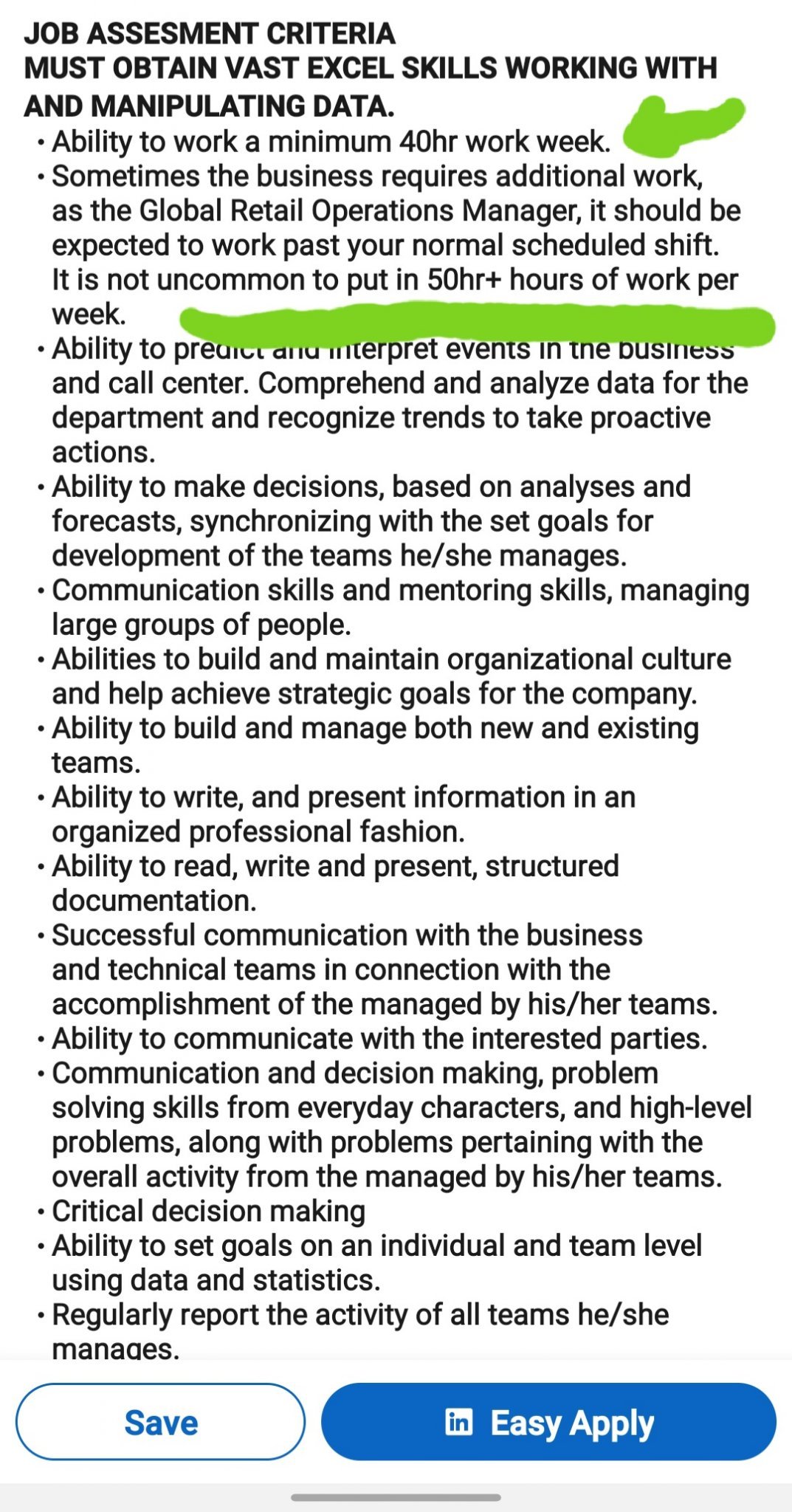 Това изискване за работа повече от 40 часа е често срещано в американските обяви за работа - там често директно си пишат, че очакват 50-60 часа работна седмица. Предполагам, че фирмата има американски корени или мениджмънт. Като изключим това, другите изисквания според мен са ок за мениджърска позиция, която има търговски или business development функции. Не съм запозната с нивата на заплащане в тази сфера, но си мисля, че поне 4000 - 5000 лв. трябва да  е заплатата.