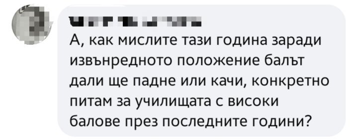 Хаха, ето защо децата ни логично няма и не трябва да бъдат в едни и същи училища. На мен този въпрос не ми изглежда чак толкова смешен, защото извънредното положение повлия на качеството на обучение в някои училища. И на изисквания, домашни и т.н Отрази се на психологическото състояние. Как е повлияло- положително или отрицателно, е друг въпрос. И после моето ще изръси подобна глупост и ще се чувства неудобно, че не познава елементите на статистиката и причинно-следствени връзки.