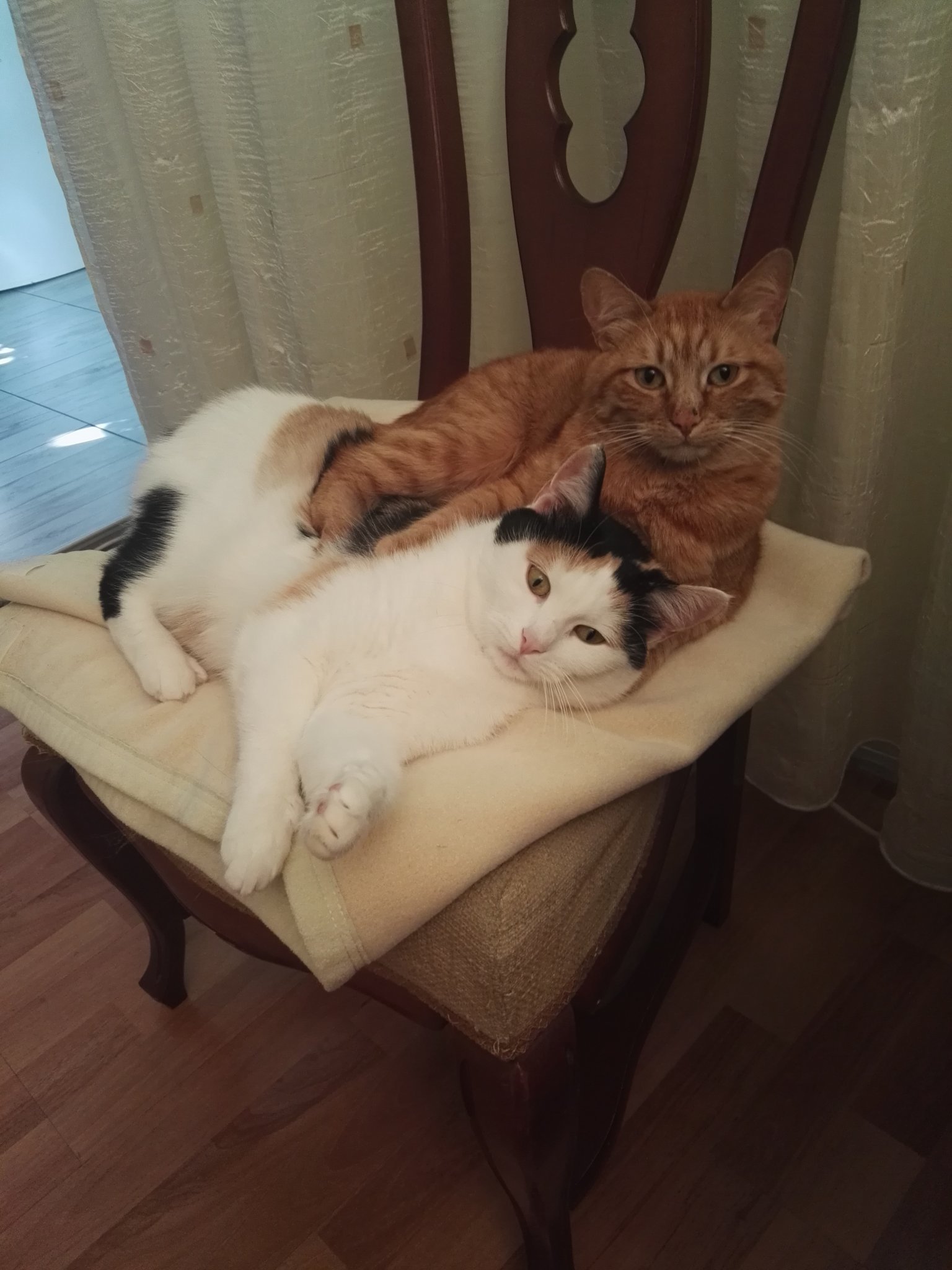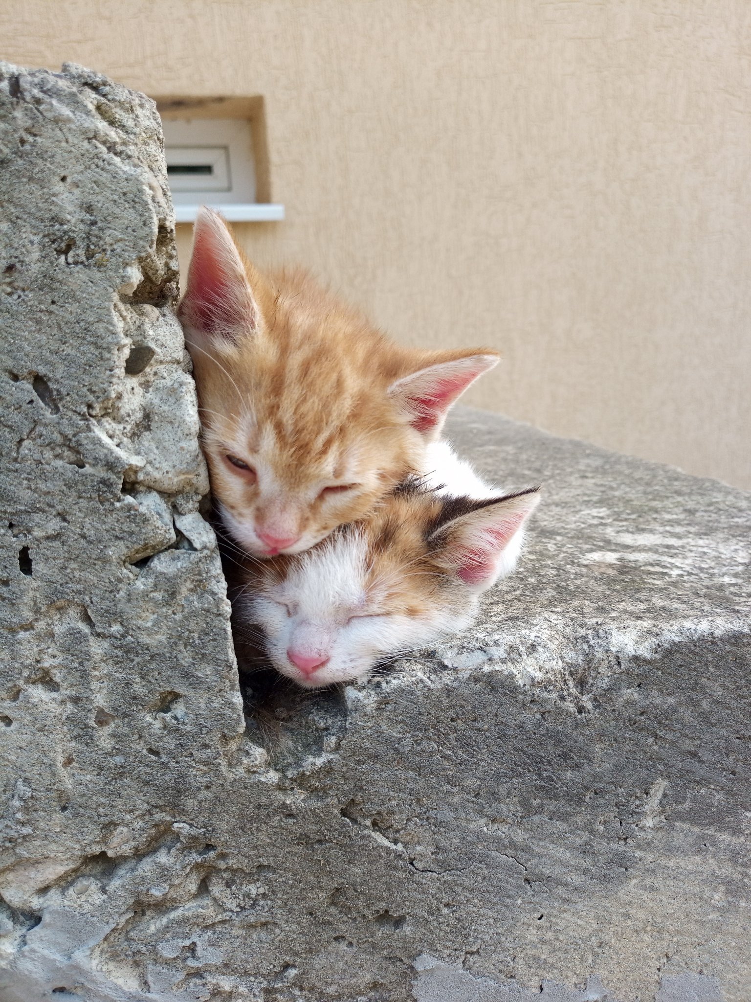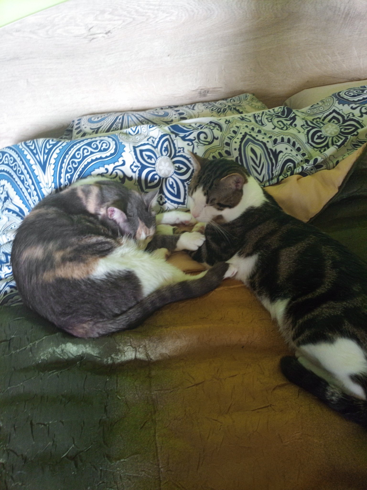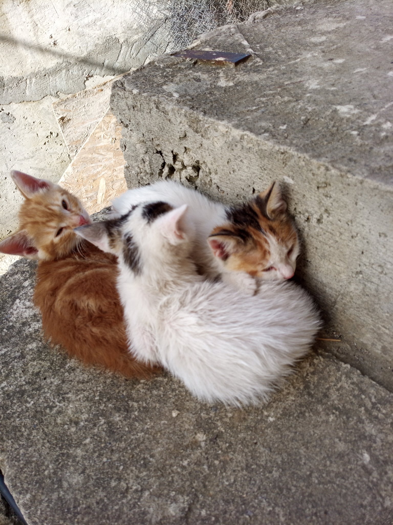 и двамата са много мили и любвеобилни ,но женската е по - нежна. Като повечето други котки ласките ги получават , когато те решат , че искат (което за щастие е често) . И за последно едни малки дворни рожденици . Днес навършват 2 месеца.