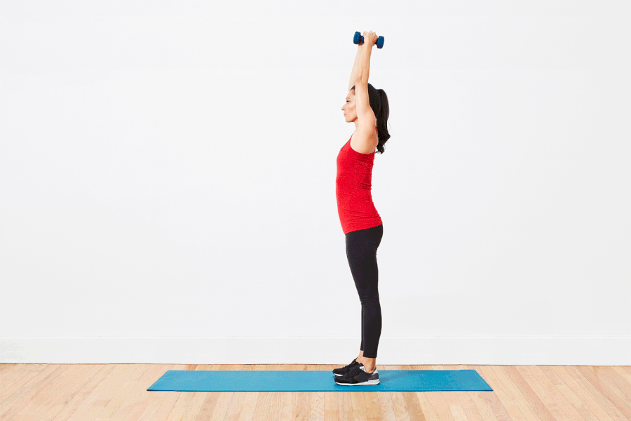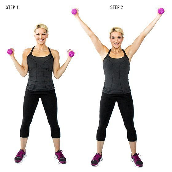 Втората част C - complexes. Състои се от три упражнения в комплекс. Комплексът се прави 3 пъти по 10 повторения. Ръцете са малко по встрани от момъкът показан по-долу и с двете гири едновременно се правят curls. Ръцете трябва да застанат пред гърдите след това се изправят над главата и се изпълнява overhead triceps extension. Гирите трябва да се върнат отново в положение пред гърдите и оттам ръцете се отпускат надолу и се изпълнява bicep curls. Това е втората част.