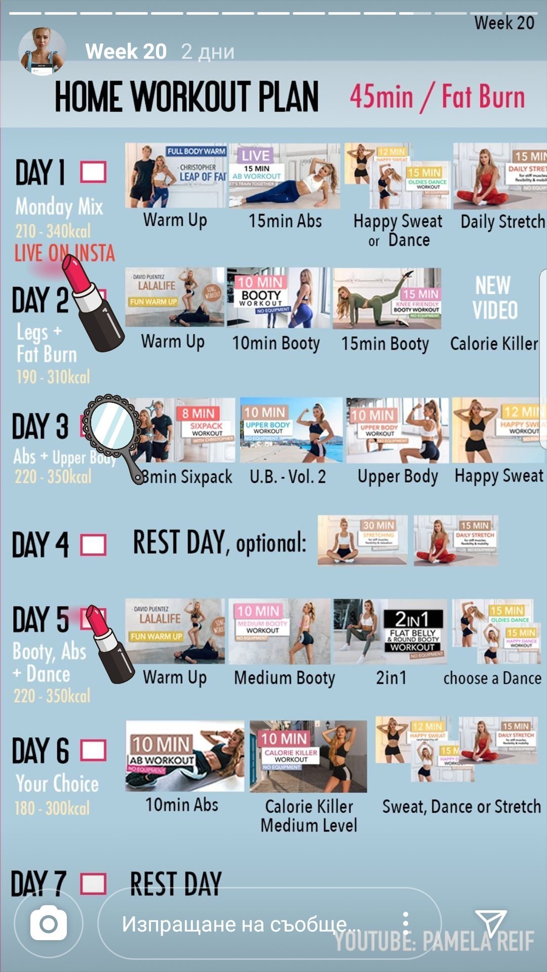 Влизам да споделя, че ХиЧ не ми допадна. Може би защото имам само гирички по 1 кг и не ги усещам тренировките. Тази седмица тренирах по календара на Памела