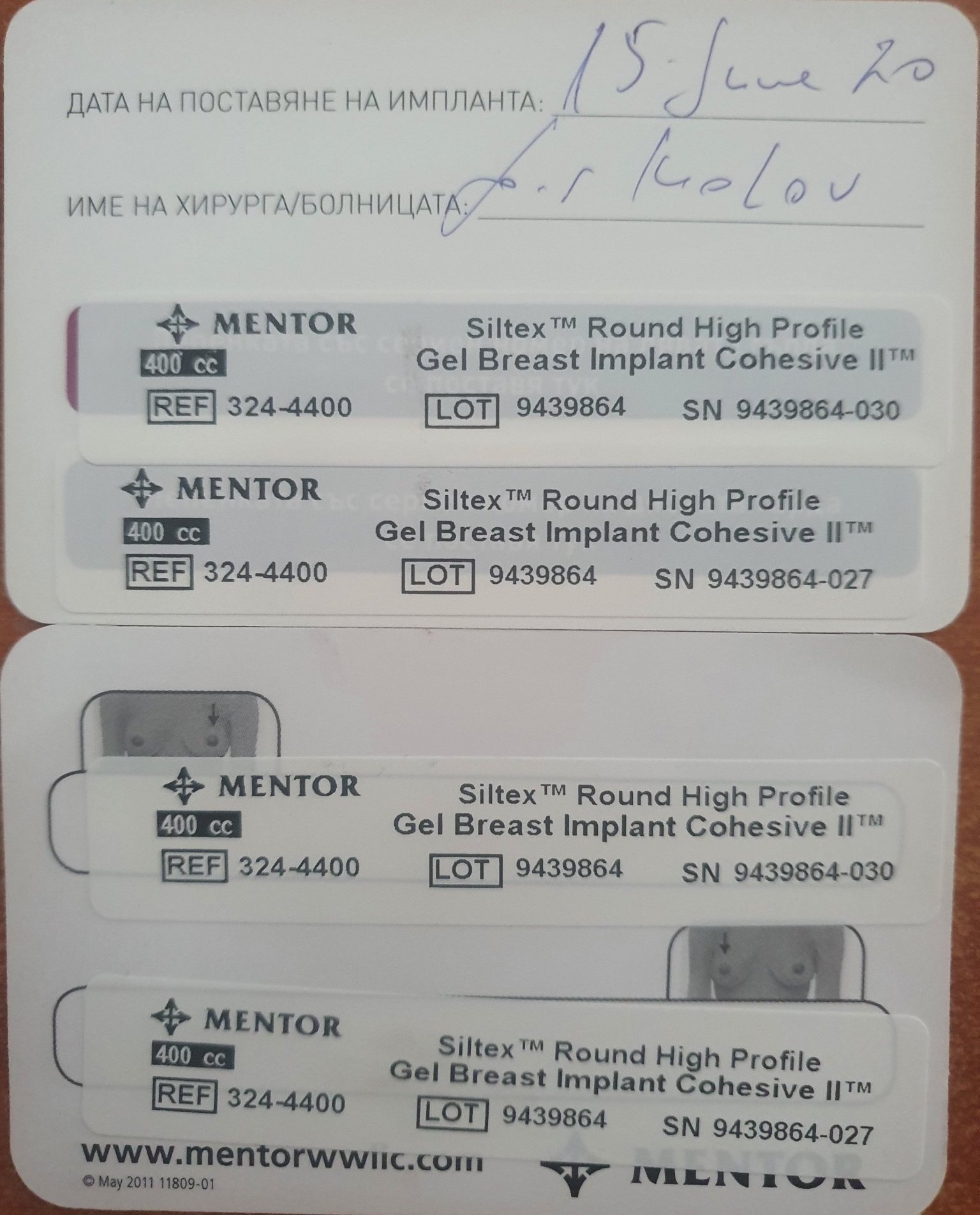 Включвам се и аз с един и същ имплант за двете гърди в паспорта! Реших, че защото съм карък по начало, е станало така.Но сега ми става ясно, че проблемът е може би е по-сериозен! Аз съм без епикриза също! Преди да ми вадят конците, на четвъртия ден от операцията опитах да си регистрирам имплантите, но греда. В този момент се разрових и разбрах, че за двете гърди е поставен стикер на един и същ сериен номер. Свързах се с Мария и каза, че докторът ще оправи паспорта в понеделник като свалим конците. Е не стана точно така, но след няколко дни ми пратиха нов паспорт с два различни серийни номера. Опитах се и тези импланти да регистрирам, но не се получи.Започвам сериозно да се притеснявам, днес писах на Мария за епикризата, ще видя какво ще ми отговори.